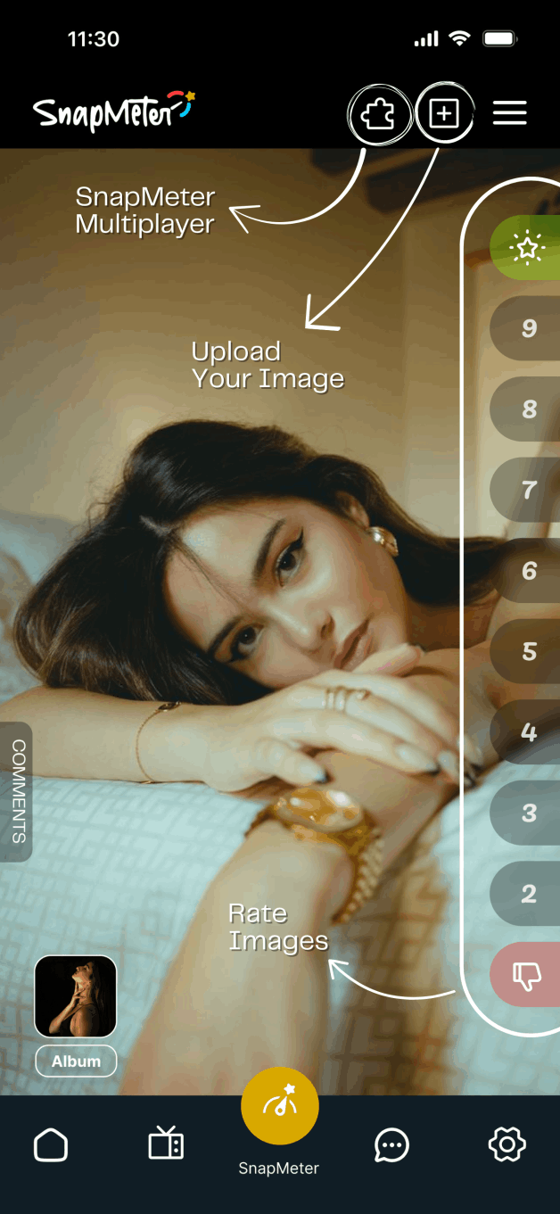 ✅ Snap, select, and upload your picture instantly to join in SnapMeter. Every upload puts you in the spotlight, ready to be rated and climb the leaderboard.